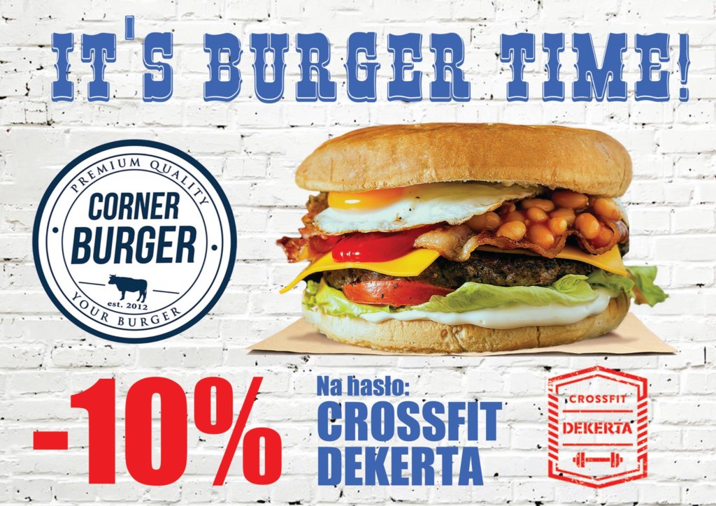 Jak wiadomo społeczność CrossFit’u to „Burgerożercy”. Już teraz w Corner Burger możecie uzyskać zniżkę na hasło „CrossFit Dekerta”! Czas uzupełniać kalorie po tygodniu treningowym!